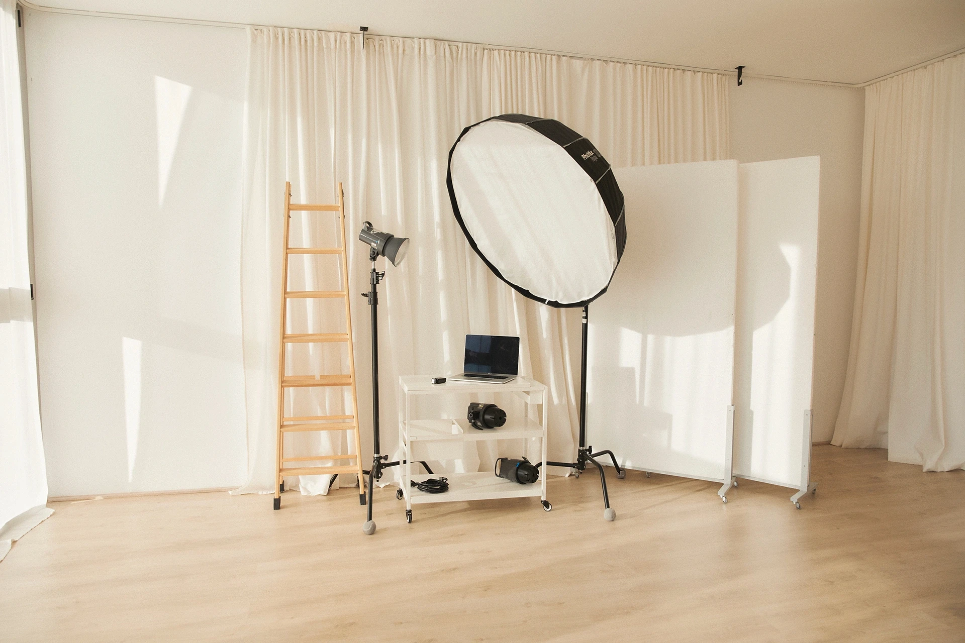Sistema de soportes para colgar fondos y telas, disponible en todo momento para adaptarse a tus necesidades creativas.