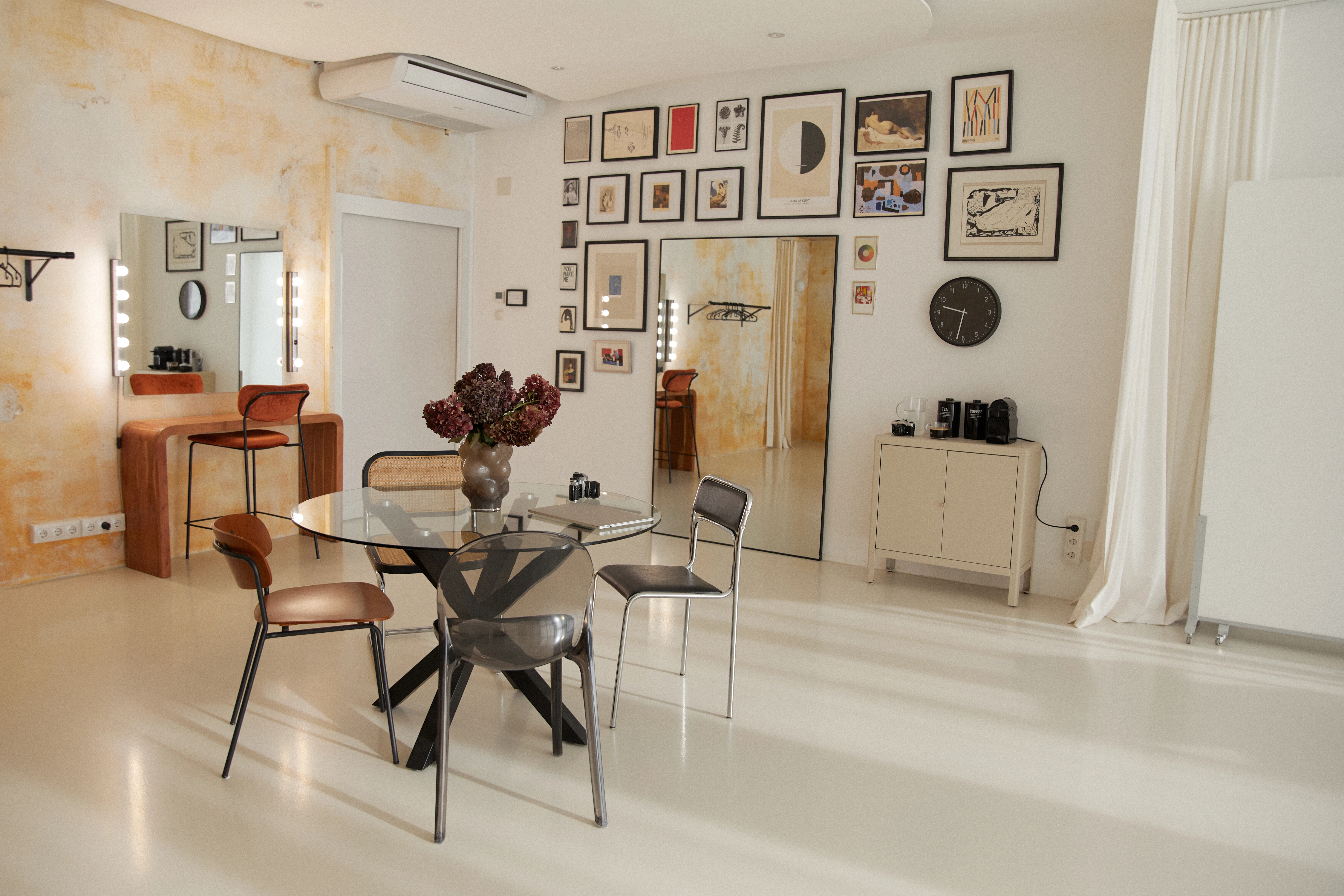 Zona de maquillaje con espejo iluminado, percheros y plancha de vapor, pensada para modelos, estilistas y equipo creativo.
