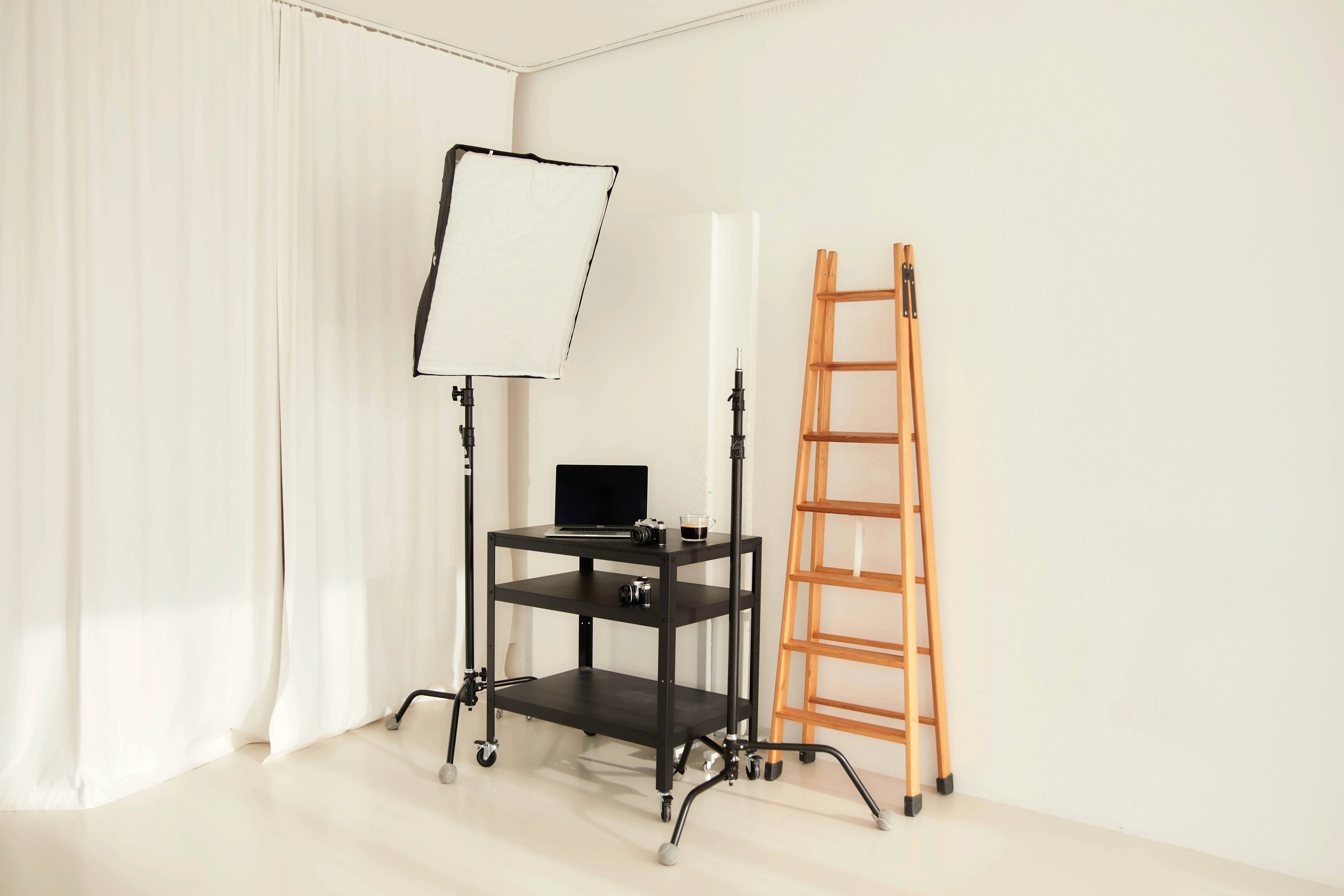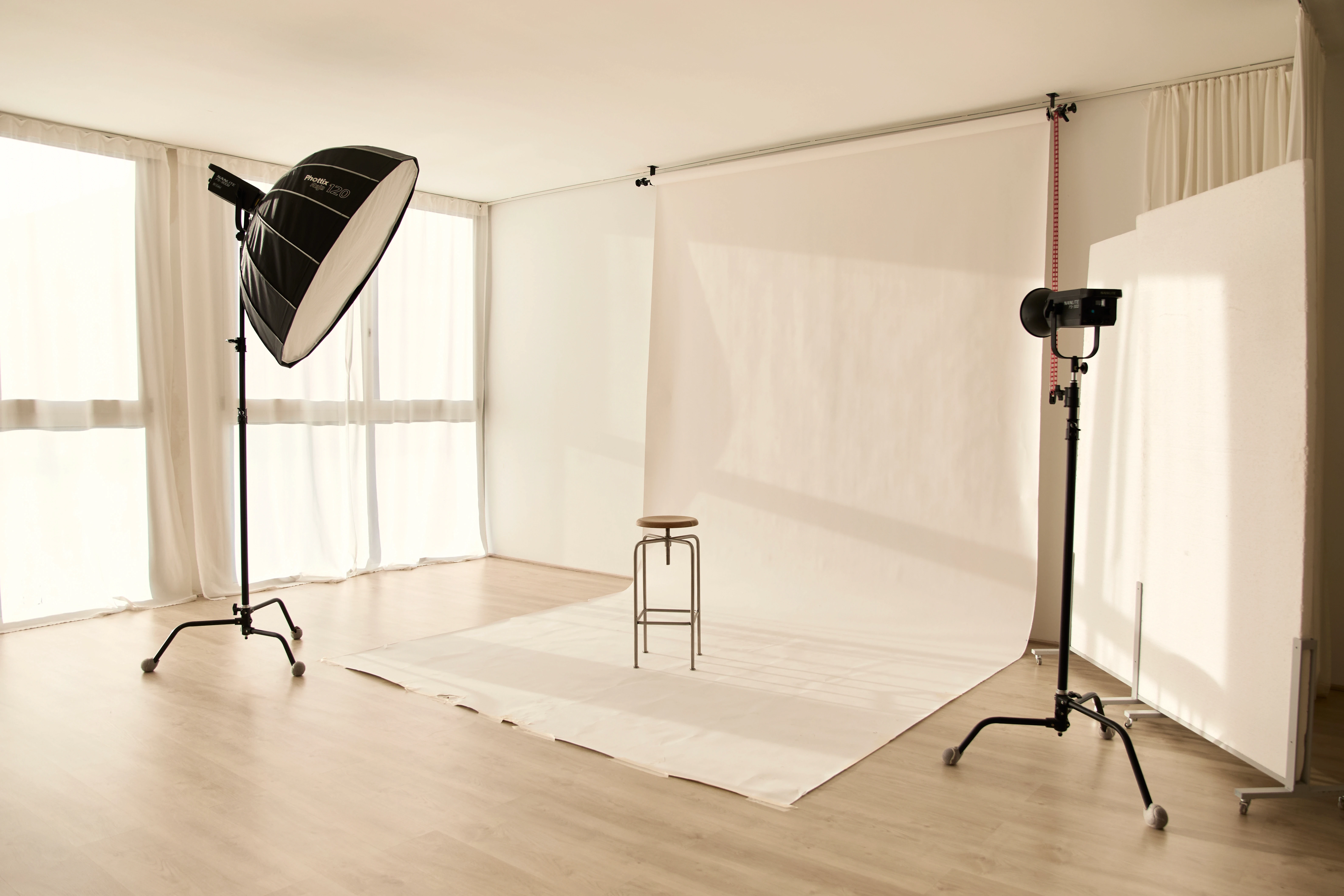 Sistema de soportes para colgar fondos y telas, disponible en todo momento para adaptarse a tus necesidades creativas.