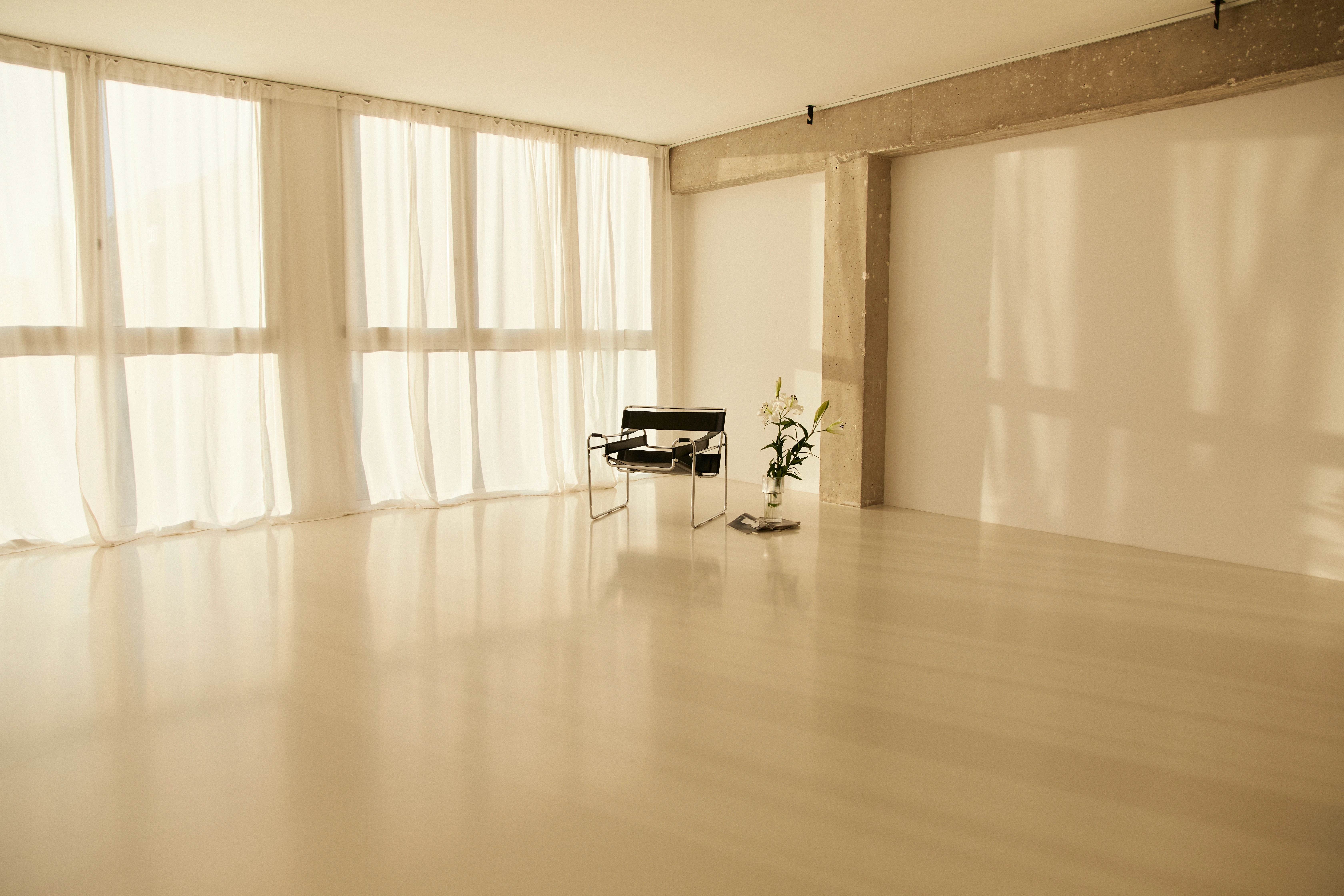 Un estudio de fotografía con luz natural gracias a sus ventanales de 3x6m orientados al sureste, perfecto para producciones profesionales durante todo el día.